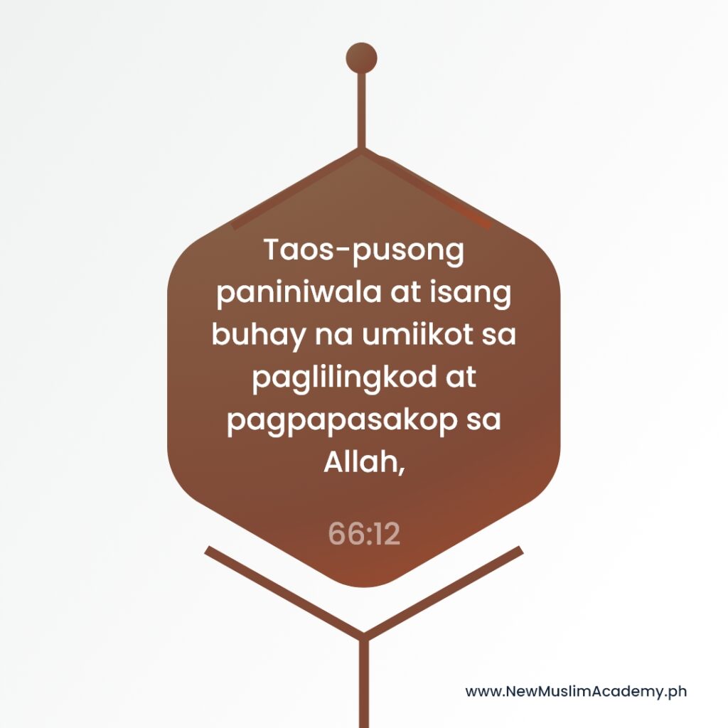 - Taos-pusong paniniwala at isang buhay na umiikot sa paglilingkod at pagpapasakop sa Allah, [66:12]