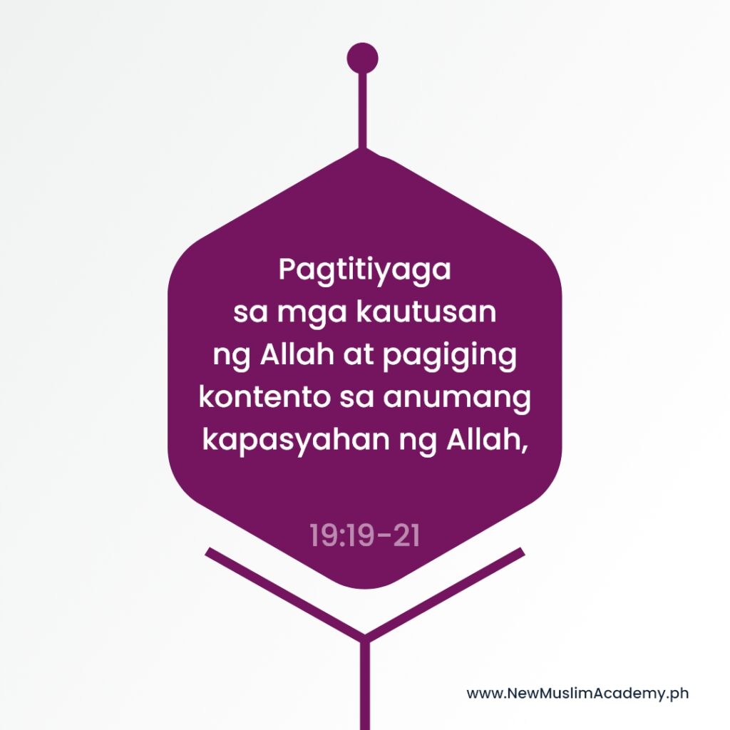 - Pagtitiyaga sa mga kautusan ng Allah at pagiging kontento sa anumang kapasyahan ng Allah, [19:19-21]